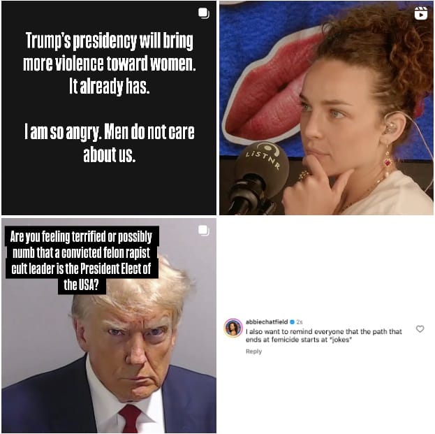 オーストラリアのTV司会者 アビー・チャットフィールドは、彼女らが女性蔑視者とみているトランプ氏の当選を受けて、女性がセックスストライキを行い、パートナーの要求を拒否するよう訴えました。 https://www.instagram.com/p/DCFp-NETvAE/?utm_source=ig_embed&ig_rid=68658fd8-06df-44a2-826e-5f576290d1bc